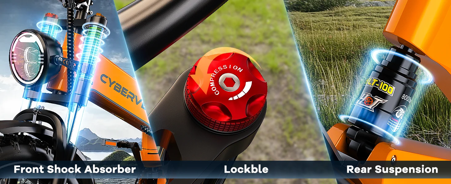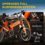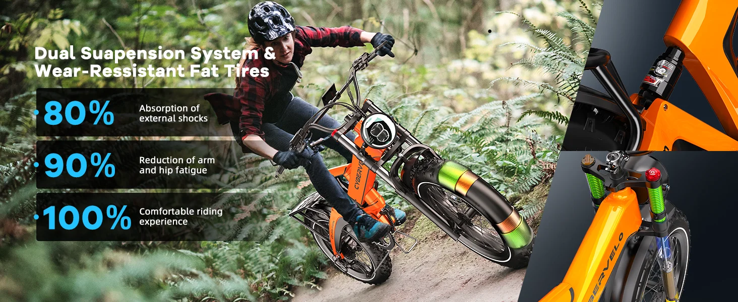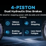 Dual Suspension & Hydraulic Disc Brakes: Electric bike for adults experience ultimate comfort and safety with advanced front and rear dual suspension, designed to absorb shocks from bumpy roads and rough trails. The hydraulic disc brakes deliver powerful and responsive stopping with minimal effort, ensuring precise braking control in all conditions. Ideal for high-performance e-bikes, electric mountain biking, off-road riding.