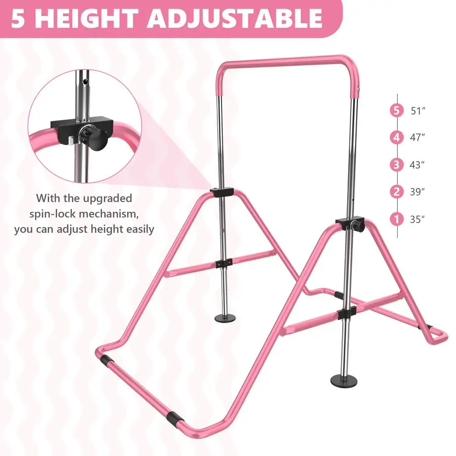 Adjustable Heights The gymnastics equipment for kids has 5 adjustable heights, so you can choose the height depending on your childs height, which means this bar fits different heights, ranging from 35.8 to 51.6